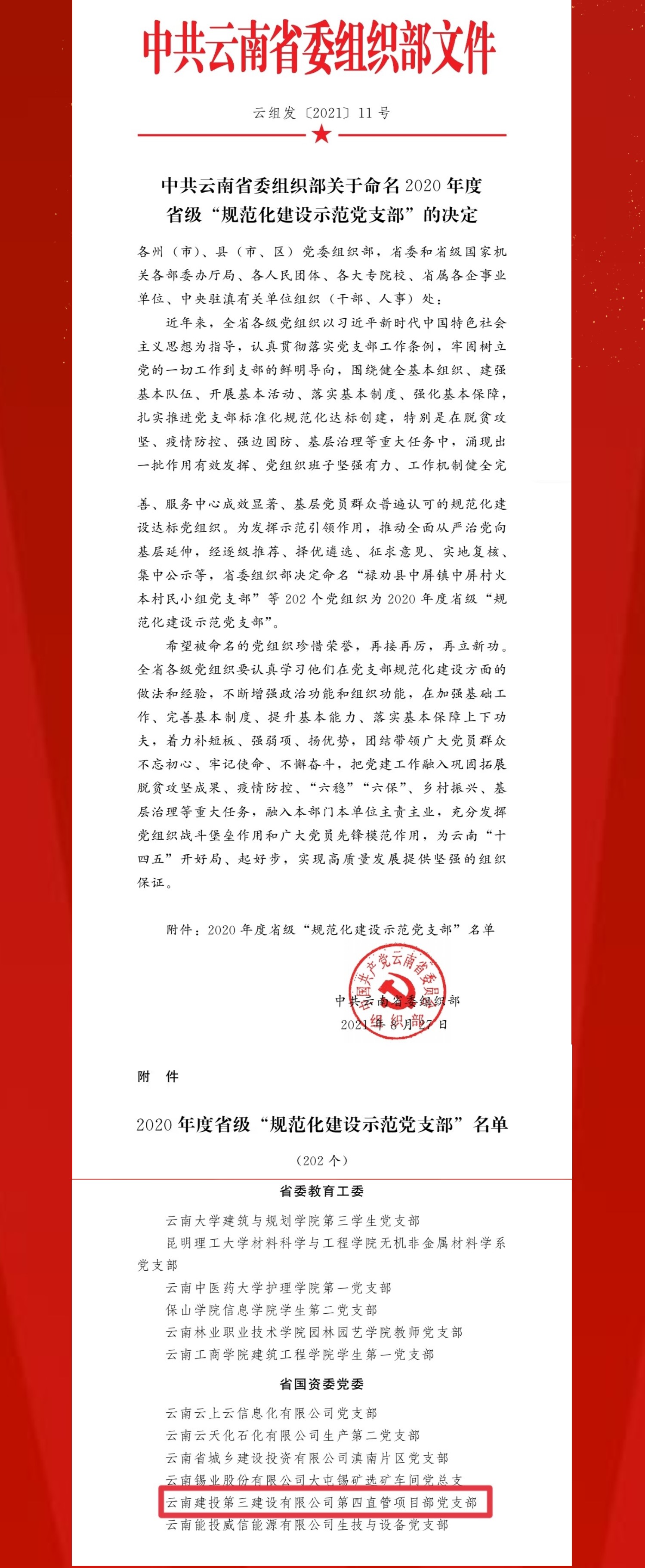 公司第四直管項目部黨支部獲2020年度省級“規(guī)范建設示范黨支部”命名